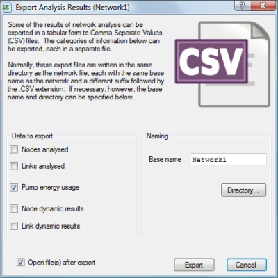Exporting Analysis Results to CSV files WaterSums uses the EPANET toolkit to analyse a water supply network. The results can then be exported to several Comma Separated Values (CSV) files and displayed immediately if desired.