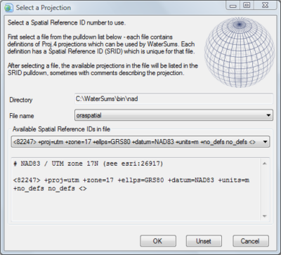 WaterSums uses the Proj.4 cartographic projections library internally and provides a panel for selecting from the available projections.
