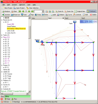 Map contours are generated from the elevations of the network nodes. The Contours button on the Network Toolbar toggles the display of contours.